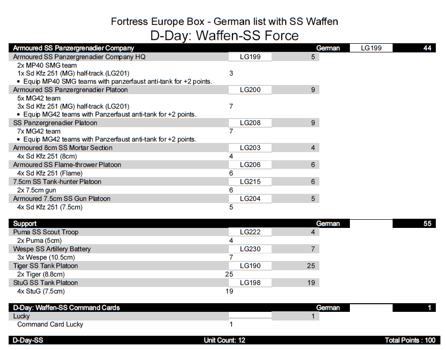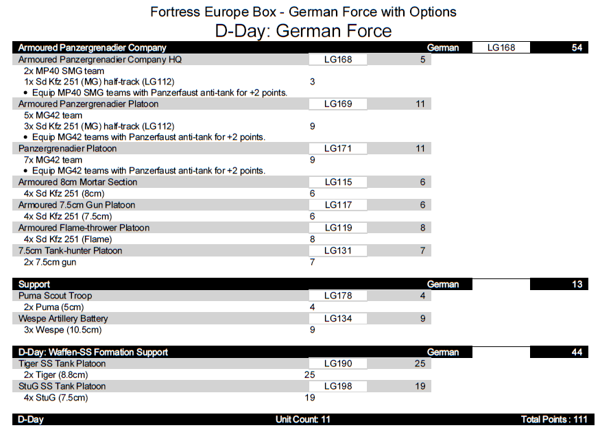 Alternatively, you can convert the Armoured Panzergrenadier to an SS Panzergrenadier formation — the SS are hit on 3+, have improved morale (3+) but worse skill (4+), and the formation is nearly identical to our Wehrmacht version but costs 14 points less — bringing our list to exactly 100 points.