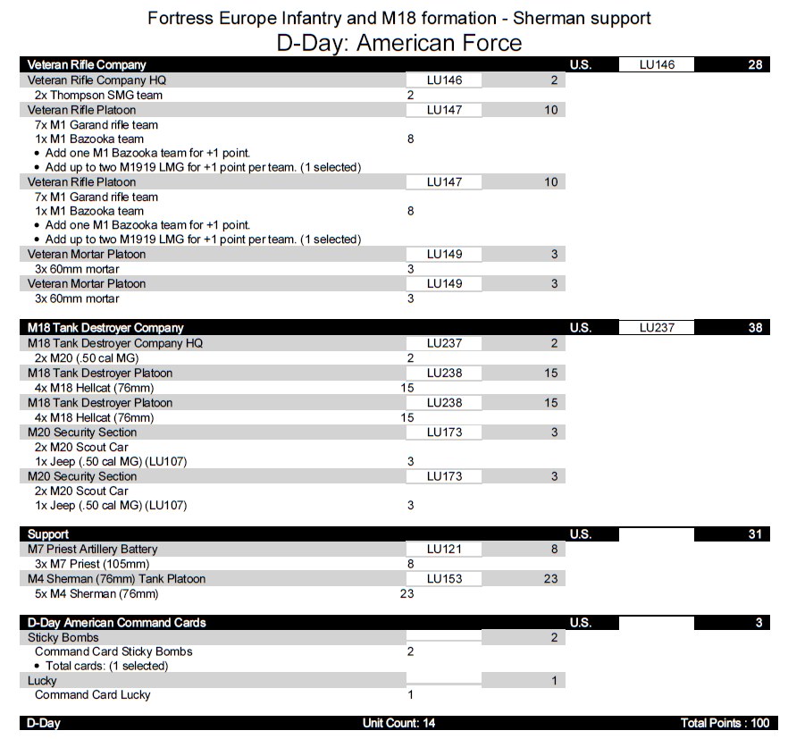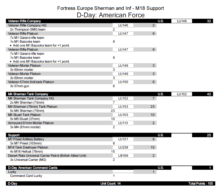 We group the four M18s we already have into a single support platoon and build the list around two formations: an infantry formation (as seen earlier, but now with the addition of a 57mm anti-tank gun to better withstand armored assaults), and a tank formation with five Sherman 76mm and five Stuarts, creating a fast-response and assault force. For scout and spearhead, we introduce the cheap and reliable British Universal Carrier allied platoon, to save a couple of points – but you can sneak in the M18 scouts, if you already have them.