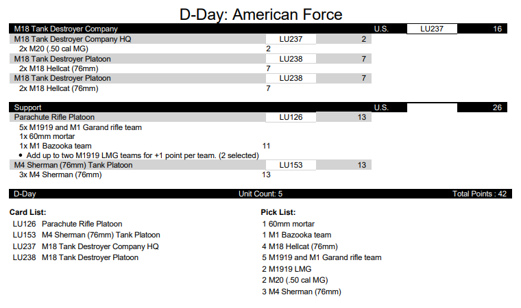 On Uncle Sam’s side, we get a tank destroyer formation featuring an HQ with two M20 Scout Cars and two platoons of 2 M18s each. For support, there are three 76mm Shermans and a parachute rifle platoon, totaling 32 infantry figures.