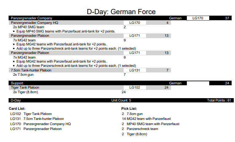 Here’s the list — it adds up to 113 points, giving you a little flexibility for your first games. Don’t forget the Command Cards: you can adjust the final points total by adding cards like Panzer Pioneer Platoon, which improves infantry performance in minefields (just +1 point per platoon — a bargain), or 116th PD Greyhound, which reduces the point cost in exchange for worse Last Stand and Tactics stats.
