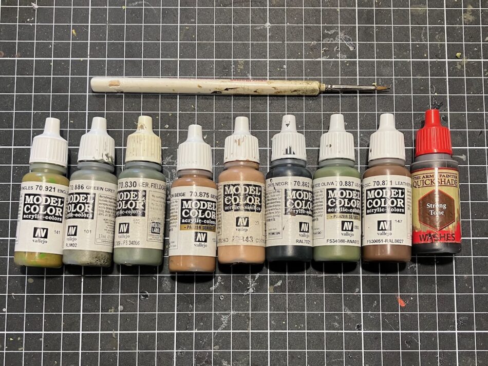 The paints I am using are from the Vallejo Model Color range, and I will be sticking reasonably close to the recommendations in the British painting guide in Blitzkrieg. I am using an Army Painter Regiment paintbrush for everything.