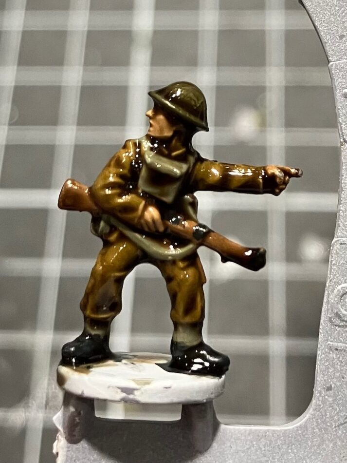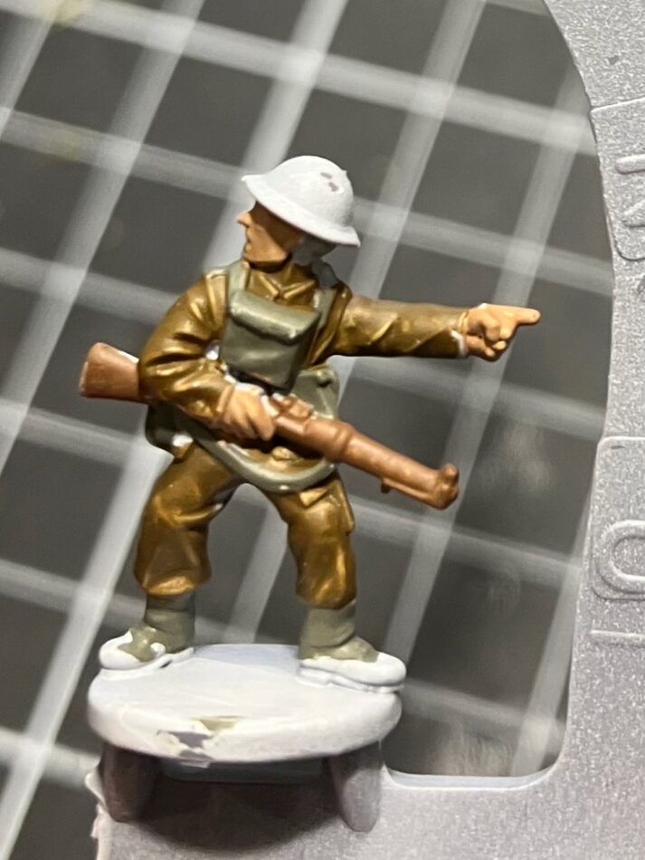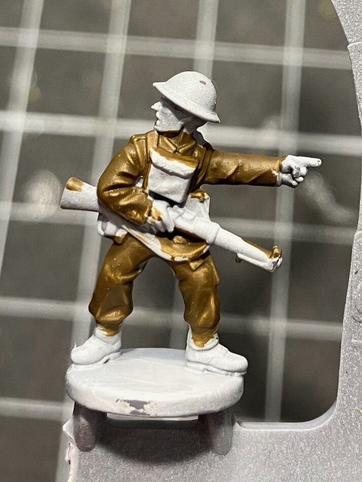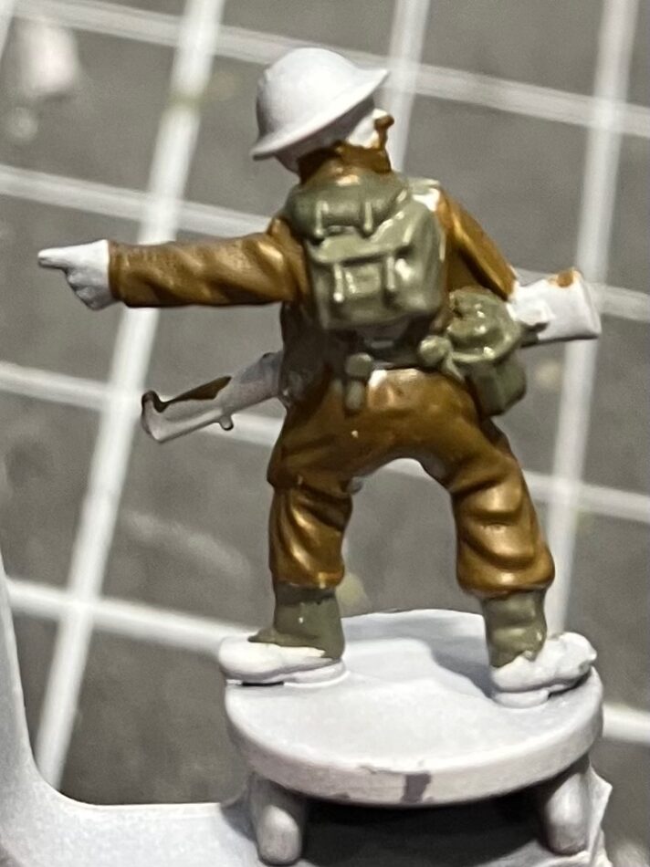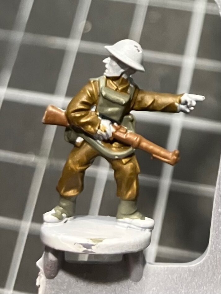 Continuing to work outwards, next is his Lee Enfield rifle. I always search up a picture of a weapon before painting it, to double-check which parts are wood, what is bare metal, and whether there are any other colors on it. Here, I’ve painted the whole weapon 875 Beige Brown, and will do the metal details soon.