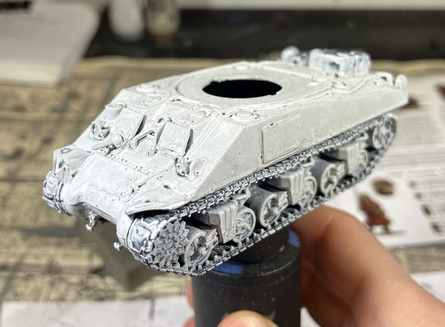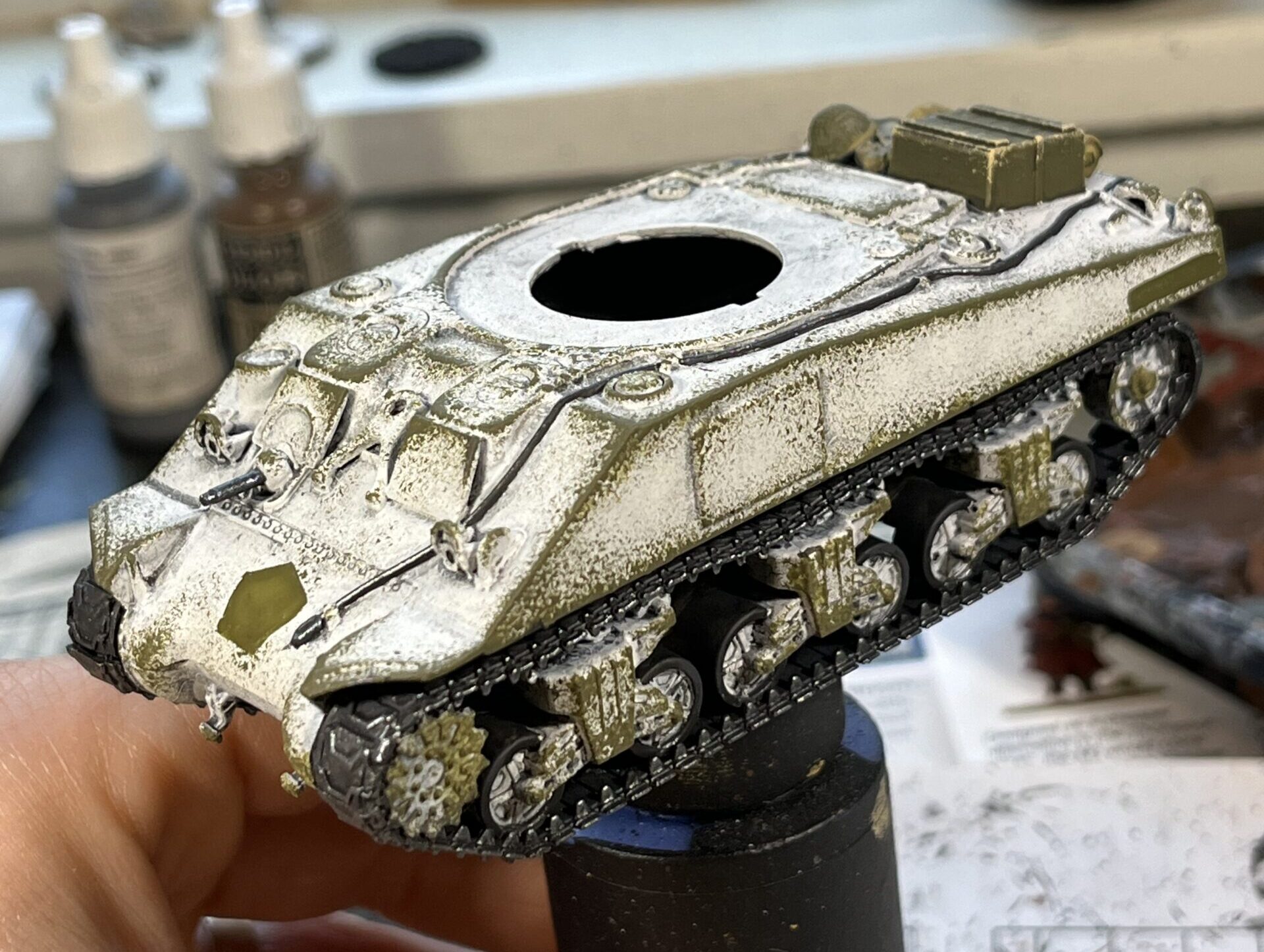 My Bolt Action army project of the year is a winter American army project. While my infantry will advance through the snow on foot, they are in desperate need of armor support. In order to fully commit to the theme I decided to paint the armor support in winter camouflage. The general idea was to paint it white with the green undercoat showing through where the white paint rubbed off.