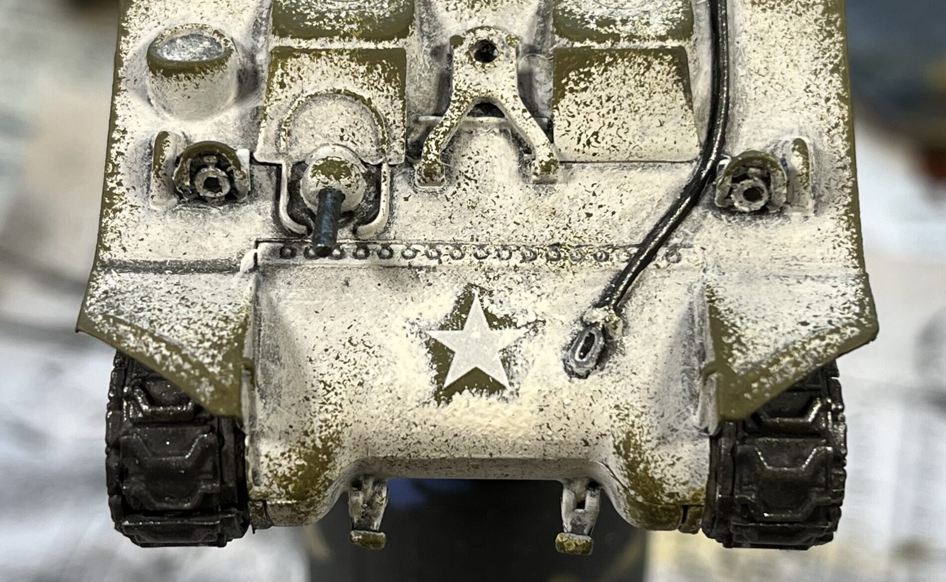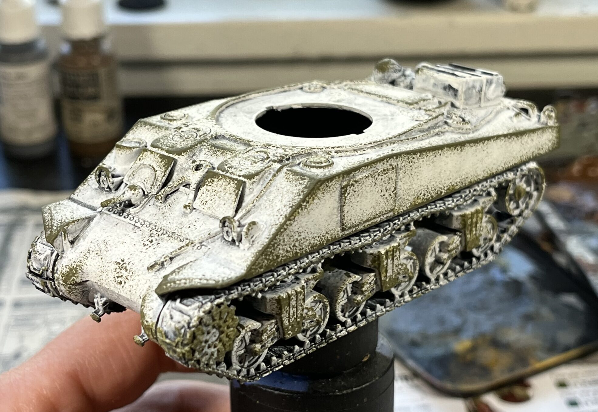 Whitewash was a thin white paste that was applied to the exterior of the tank — often in the field. The paste was designed to be temporary so that it could be cleared off when the environment no longer required it. I for one would not like to be the only white target on a backdrop of brown and green! Therefore, the whitewash easily scrapped off where the crew or environment made contact with it. This created an ideal opportunity for some sponge painting techniques to show where the white wash is coming off the edges of the tank.