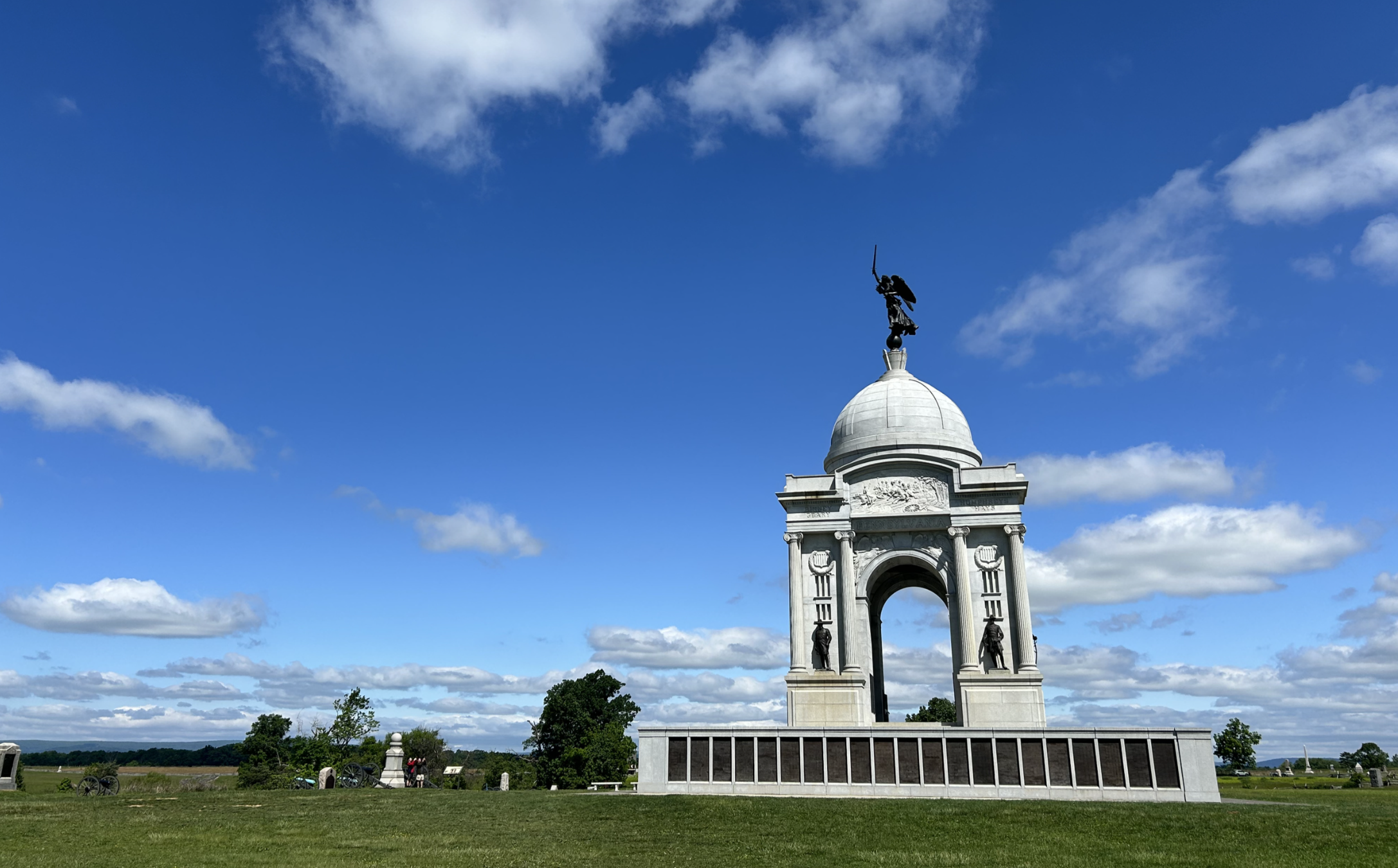 Day one: we began at the Visitor Center, where we hiked the path from there up toward the national cemetery. But, we got distracted by Cemetery Ridge, and the sign pointing to Meade’s headquarters in the Leister House. Walking by the site, we spied the monuments dotting the ridge, and ended up seeing the sites in the middle of the Auto Tour first. From the high-water mark at the infamous Copse of Trees that Longstreet points out, to the Pennsylvania memorial. We walked most of the center of Cemetery Ridge.