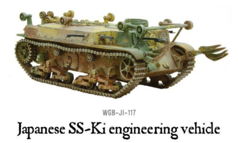 And finally, we have the SS-Ki Armored Work Vehicle: one of the most unique vehicles in all of Bolt Action, and by far the most unique for the Japanese. An engineering vehicle designed to clear minefields, bridge rivers, and dislodge enemies from prepared positions, the SS-Ki comes with 3 flamethrowers mounted on its hull (which is insane).