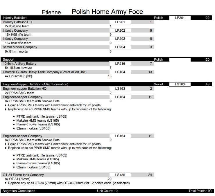 His list combines a formation of Polish infantry with mortars and 10.5cm howitzers, plus a strong Russian component including a Sapper formation, a platoon of OT-34 flamethrowers, and Lend-Lease Churchills. Basically, a Russian force with the ability to throw down two smoke bombardments. Here’s the list.
