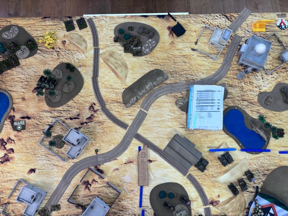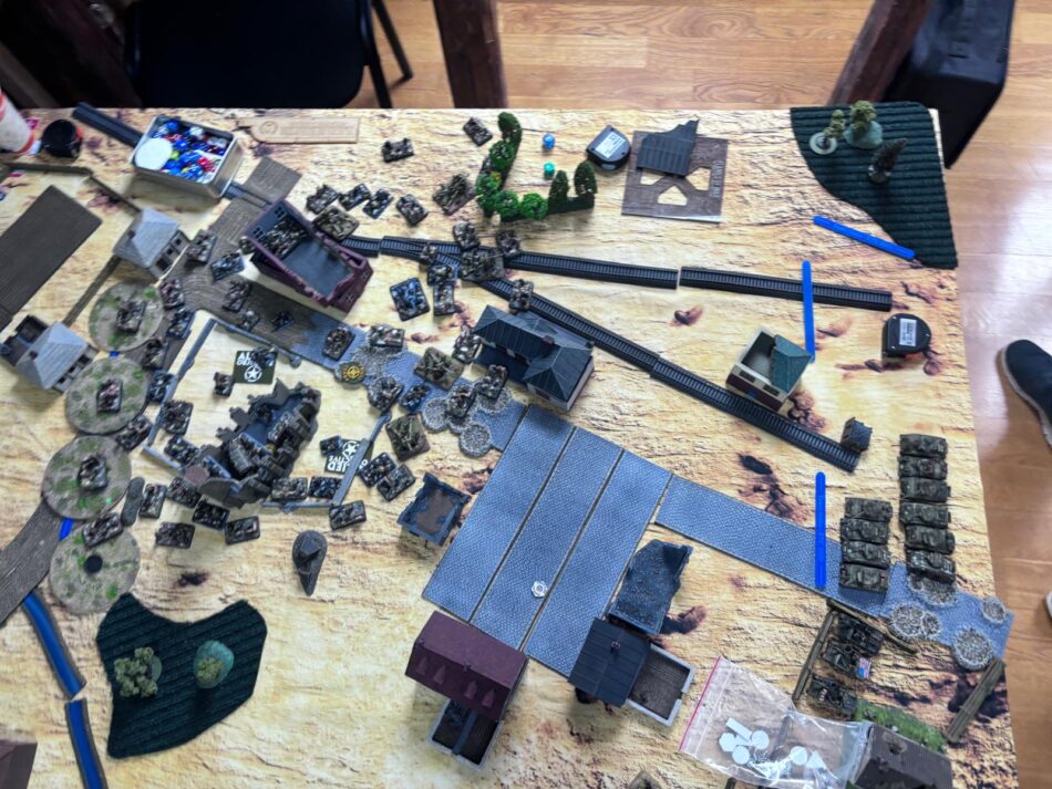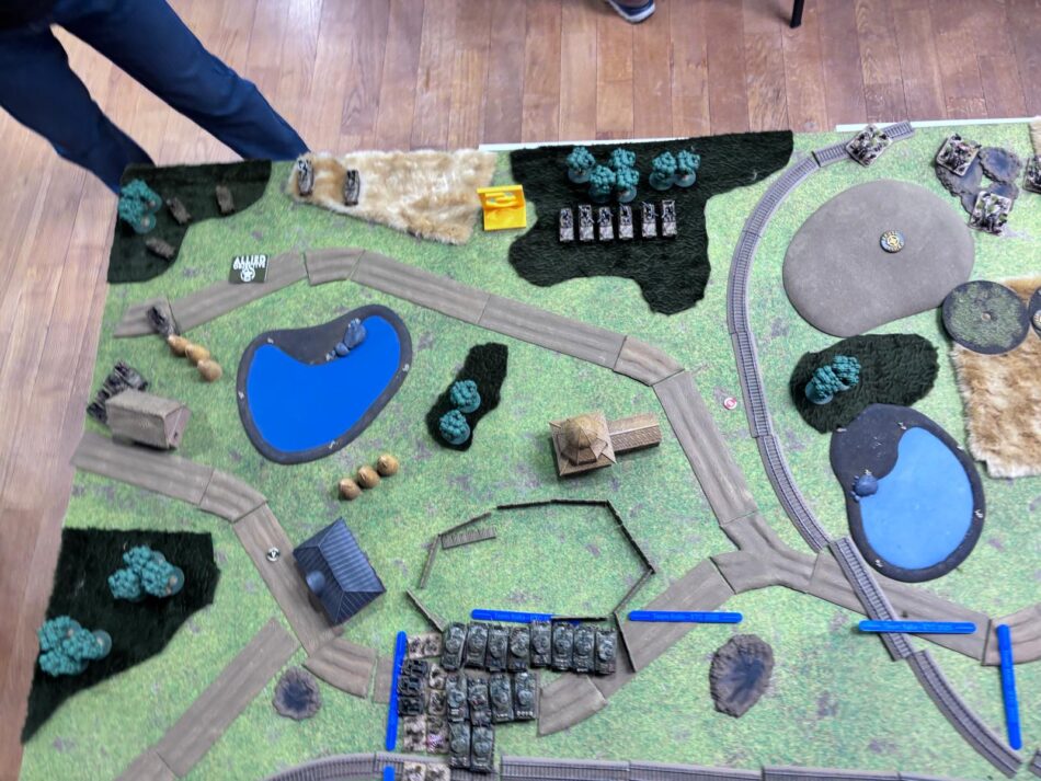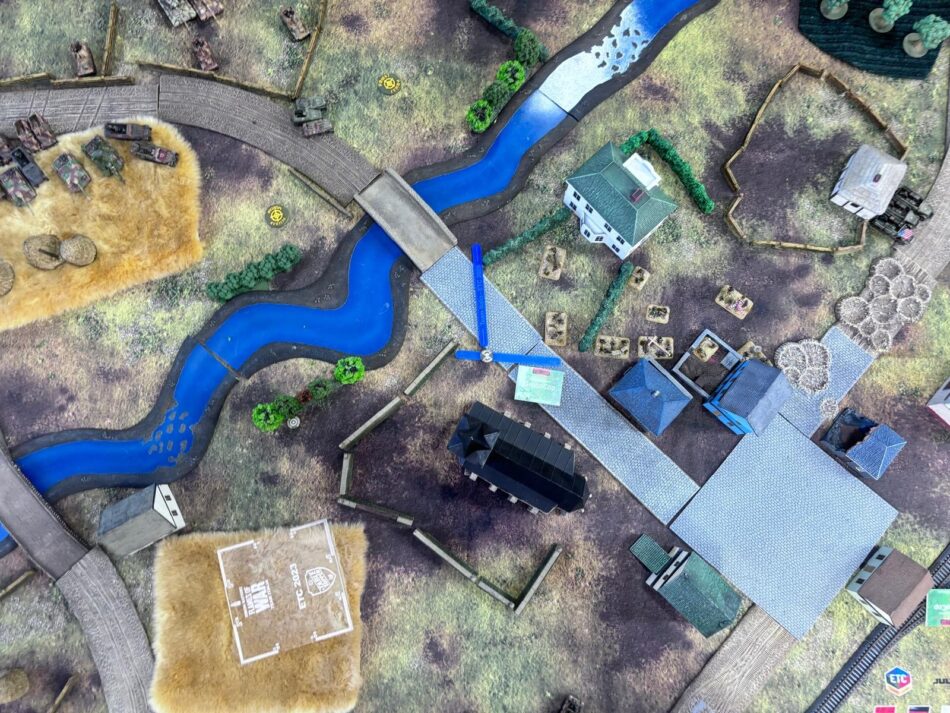 The table below is what Mihai and I faced off across. Unfortunately, my well-known and poor photography skills made me miss the Sherman unit in the bottom left. Since we both chose “Manoeuvre,” the mission was the meeting engagement Scouts Out, which is particularly tricky because one of the objectives to defend lies outside both players’ deployment zones—though only by a few inches.