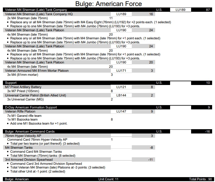 So I tried an Extra Small version of my US Sherman Veteran list, which you can find below. The list is designed so that, in case of reserves, I can leave the HQ and one Sherman platoon off-table while deploying everything else right away, including two Sherman platoons.