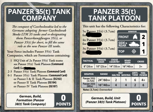 The book also shows the 35t command card. I think this may be the way to go if you want to field the most Czech tanks. Front armor two is going to die to any sort of decent AT gun but will at least survive the low-end options and heavy machine guns. You save a few points over the 38t, losing a point of side armor and two inches of movement. You can’t mix and match the 38t and the 35t. In a formation it’s one or the other.