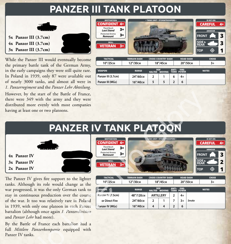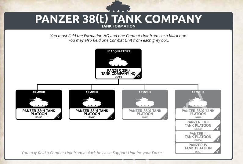The formation is an HQ with two 38t, then two platoons of 38ts. After that you can bring a third 38t platoon and then a fourth platoon option with either a 38t, Panzer I and II, Panzer II, or Panzer IV option. No options for Panzer IIIs in this force.