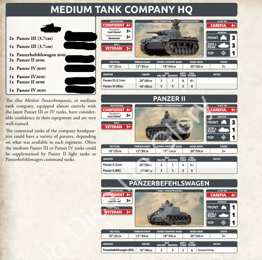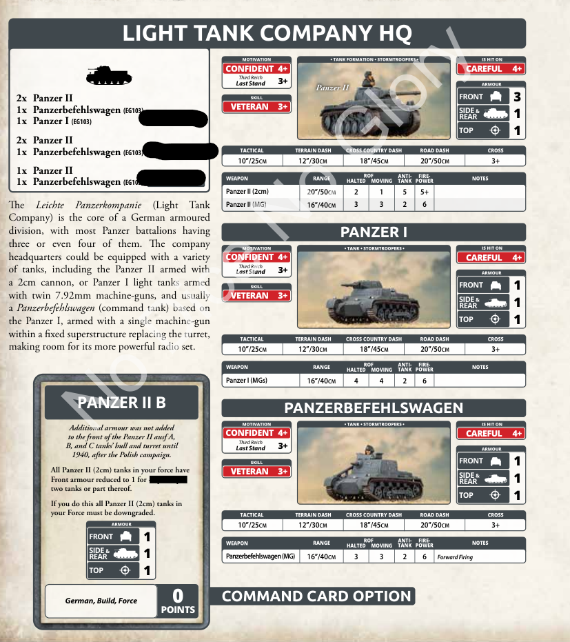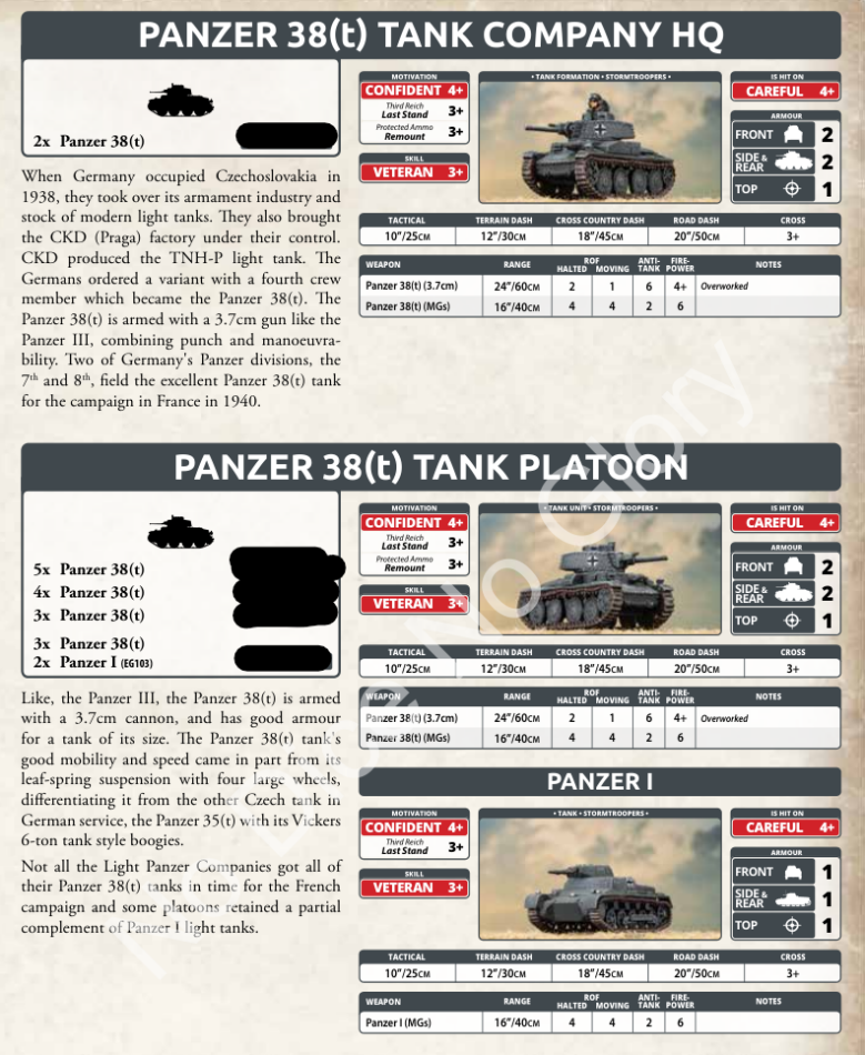 The 38t company is interesting. They’re a bit more expensive than Panzer IIs but have one more AT and FP though with an overworked gun. They keep the same good German skills and can mix in Panzer I to reduce the cost of the platoons.
