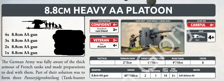 9. After reading the Blitzkrieg article covering the French and seeing that 5 Somua tanks come in at 29 points (a fraction under 6 each), I’m outraged with the cost of StuG’s being 2 for 21 points! Both are FA4, SA3, TA1 with AT7 guns. The difference is the Somua is Confident/Trained/Aggressive, and the StuG is Fearless/Veteran/Careful. Is that enough difference in stats to warrant a 4 point cost difference per vehicle? I DON’T THINK SO! On the flip side, Germans have 2 forms of 88’s; Heer and Luftwaffe. The Luftwaffe 88’s are 5 points each with the ability to take 1=4 for a unit. I play Germans, but feel these are under costed by 1 point and the Heer 88’s by 1-2 points. Here come dynamic points already!