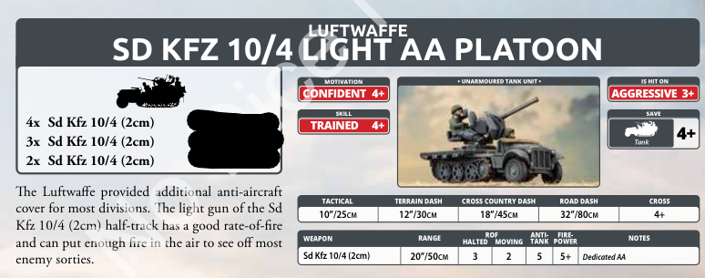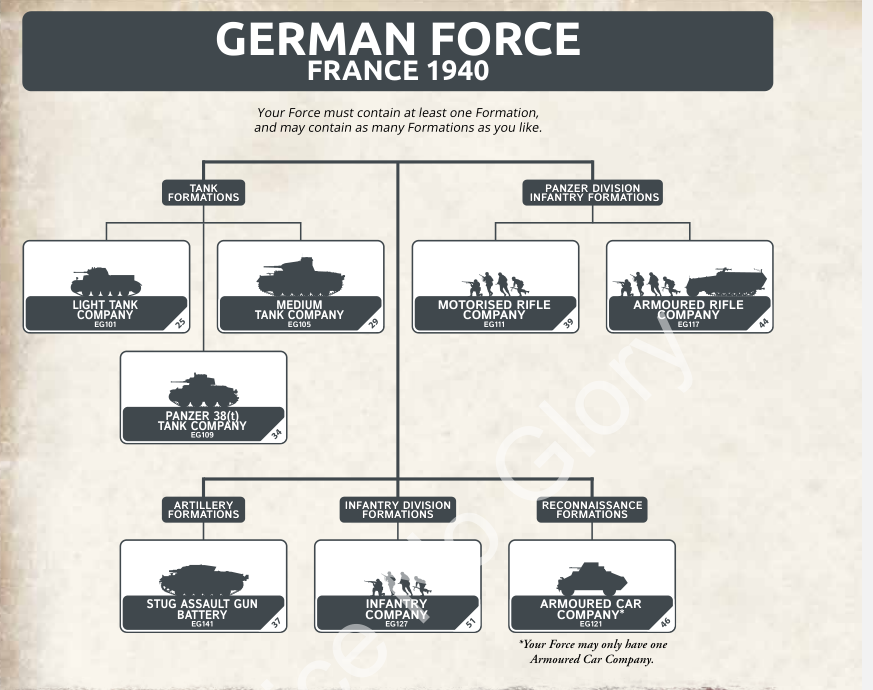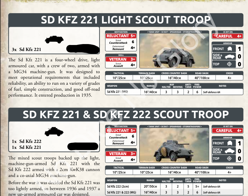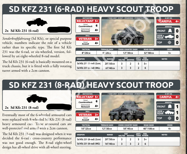 The Germans bring four tank, three infantry, and an armored car formation into battle. An interesting note is the armored car formation is specifically limited to one formation per force. Let’s look at that one first, since this is an interesting rule.