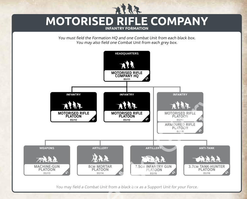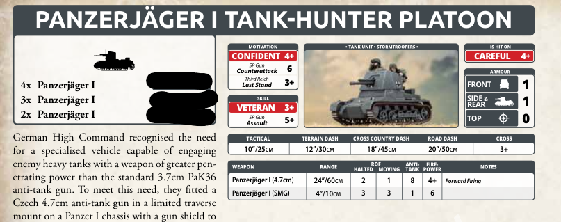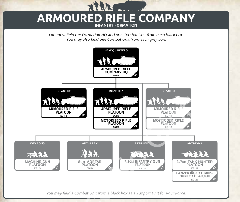 The armored rifle platoon is incredibly similar in organization, except you can bring a motorized rifle platoon for your second mandatory platoon in addition to your third platoon. You can also bring either two, three, or four Panzerjager I instead of the 3.7cm anti-tank platoon.