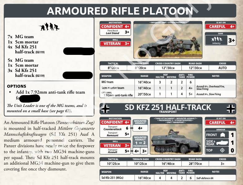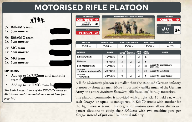 The rifle platoon is ten stands base, nine Rifle/MG and one 5cm mortar. You keep the options from the motorized rifle platoon to add an anti-tank rifle and HMG team. A 12-stand platoon hit on fours with a 3+ last stand and that level of firepower is going to be hard to move.