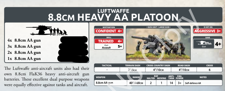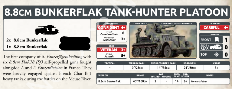 Bunkerflak are back. Unlike the 8.8 gun teams, these are more expensive and have no moving rate of fire. They also have the gigantic special rule, which means they cannot be placed in Ambush within 16 inches of an enemy team. They’re interesting and look cool, but I think the gun team version will be more widely used.