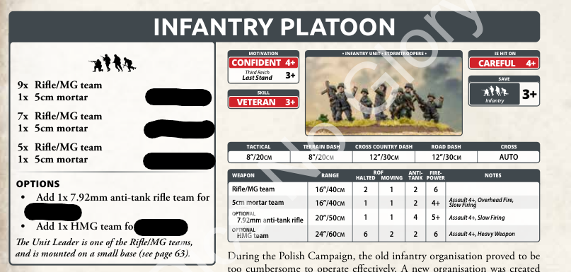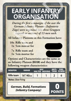 You also get the option to use the early infantry organization. This drops the platoons down to rifle teams for a slight decrease in points and adds a rifle team. The attachment options and stats remain the same. This must be done for the whole formation. For a slight point decrease and half the firepower, you get an extra stand and can still bring the HMG and anti-tank rifle. This seems like a good deal overall as I’m a fan of the larger platoon and the points savings help cover the cost of the attachments.