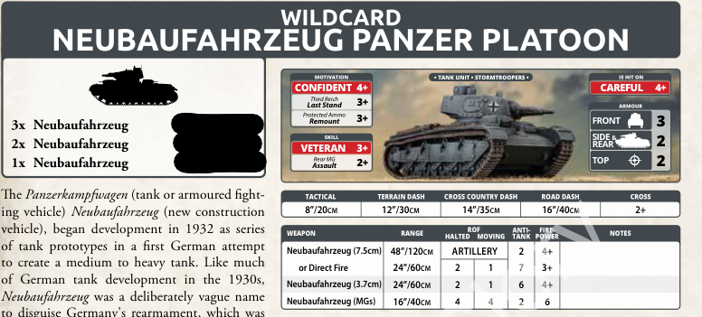 The wildcard unit is fun, though I’m not sure of its utility. I also know most tournaments hate wildcard units with a fiery passion so it’s unlikely this will get used much. It does look cool at least. The Neubaufahrzeug was a prototype German heavy tank. Three production models were made and you can bring all three. They had limited use, but seemed to be effective. The armor isn’t great, being the equivalent of a Panzer IV with better top armor. The rear MG means this hits on a 2+ in assault, which is where this tank shines. It does have the short 7.5 cm and the 3.7 cm for some decent gun options, but this is an assault tank. I think if you can pronounce the name accurately, you should be allowed to use it.