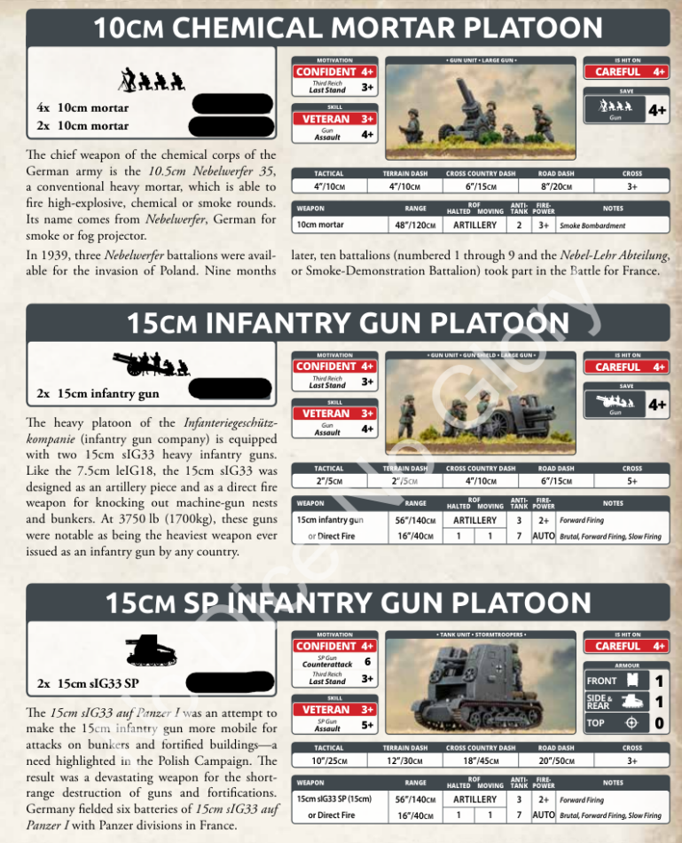 Finally, we have the humble rifle company. This is a classic rifle company, nothing fancy and giant units with a lot of good support options. The 15cm infantry gun and my personal favorite the 15cm SP gun are support options, along with both 8cm mortars and 10cm chemical mortars.