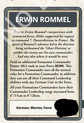 Speaking of command cards, we know we are getting one for Rommel as he is in the book. Sadly, it doesn’t look like his old model is coming back. At least I still have mine.He’s expensive, but he gives you an additional force commander in a 38t for double the cost of a standard 38t. The Rommel formation commander lets you use his leadership with any German unit in the force. Additionally, formation commanders have their leadership range extended from six inches to eight inches. Unlike in third edition, there is no extra victory point given to your opponent if he kills Rommel.