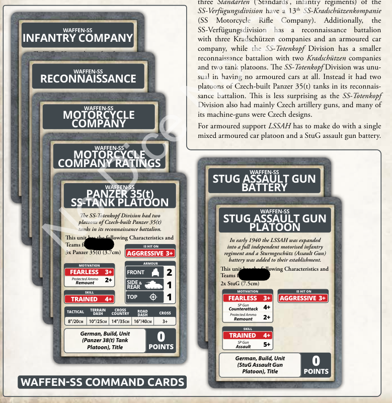 The SS are coming in command cards. Looking at the examples in the book, it seems like 3+ morale, hit on 3+, and 4+ skills. The StuG platoon comes out a bit cheaper with this and that could be interesting, but we will need to see the rest of the cards and stats. Kurt Meyer is a command card character, upgrading a formation commander. His ability allows you to pass a Blitz Move order on a 2+ when within six inches of the formation commander.