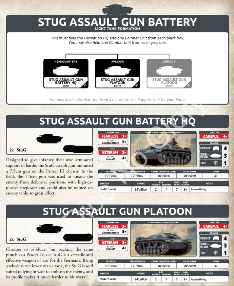 Finally, we have the StuG formation. This is the simplest in the book. It’s an HQ with two StuG and then one required platoon with two StuG. A second platoon of two StuG is optional. The StuG is tough for the time period and has a powerful gun, though this comes with a large price tag.