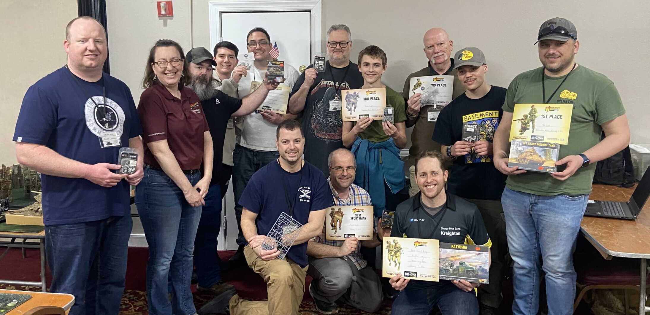 On 21 February, thirteen players gathered at the Williamsburg Muster in Williamsburg, VA to compete in another one of Kalissa Skibicki’s Bolt Action tournaments.  Most of the participants were returning players with friendly catch-ups throughout the weekend.  A few new faces joined the usual gang over three rounds on gorgeous tables prepared by David Skibicki.