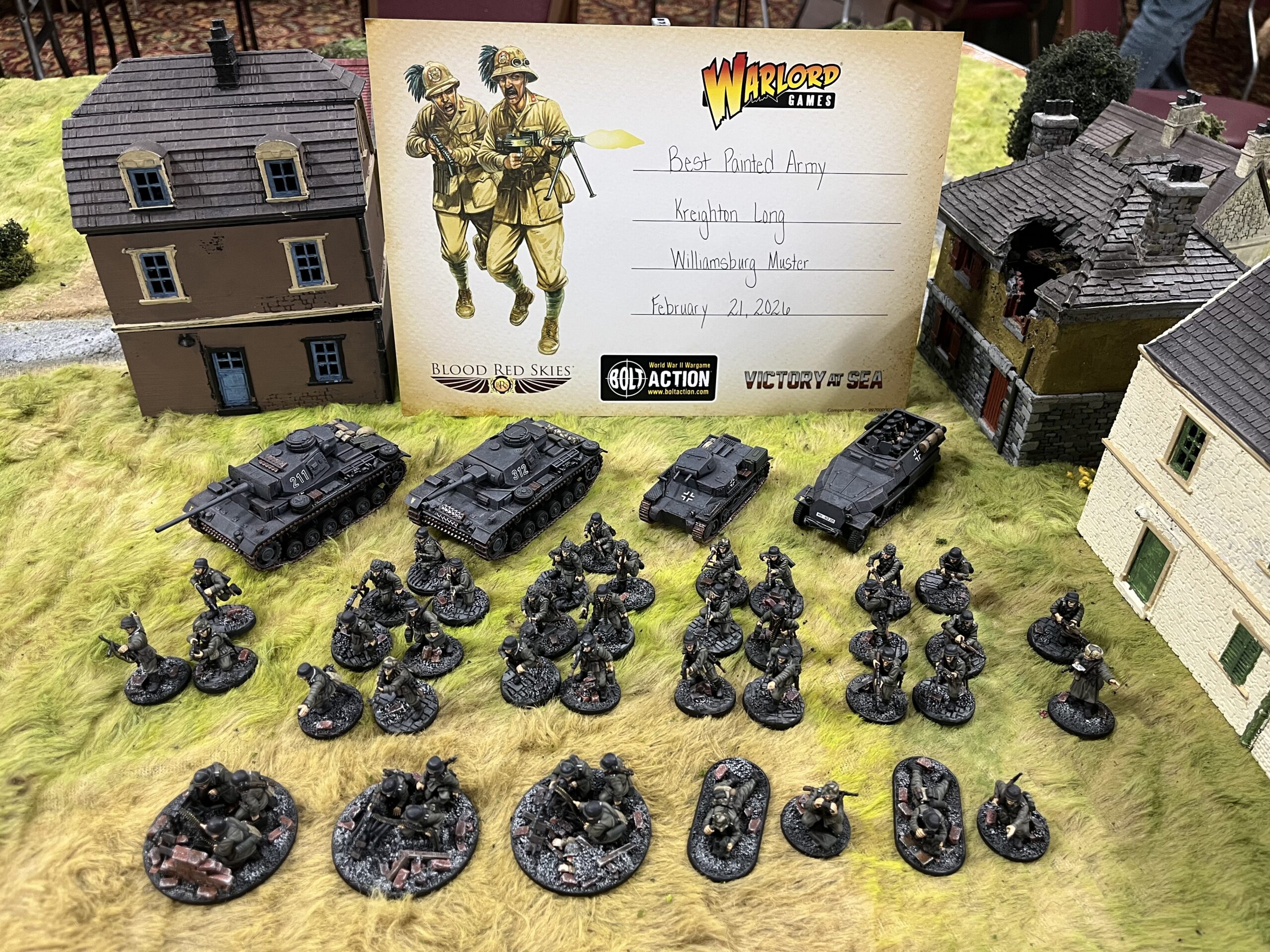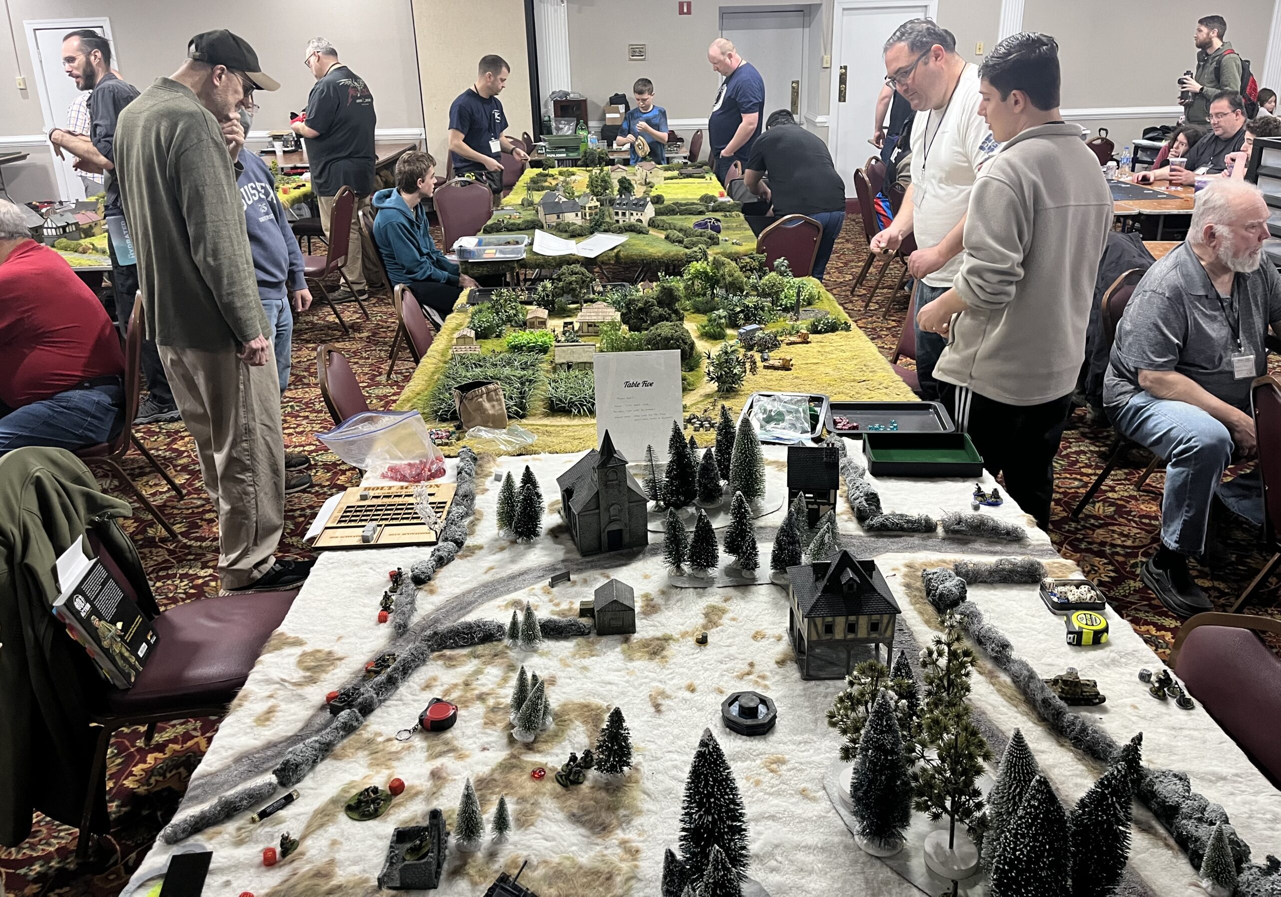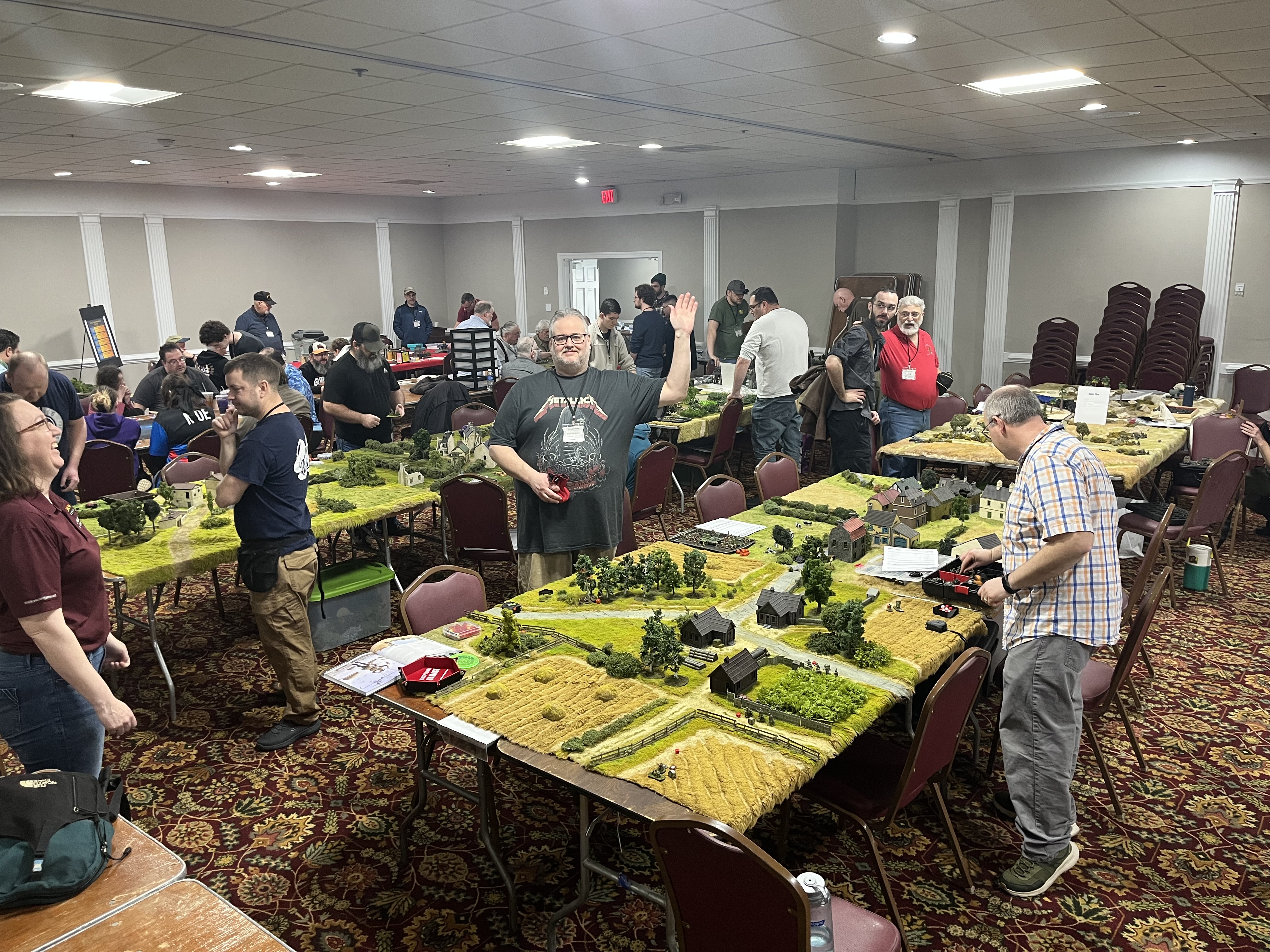 On 21 February, thirteen players gathered at the Williamsburg Muster in Williamsburg, VA to compete in another one of Kalissa Skibicki’s Bolt Action tournaments.  Most of the participants were returning players with friendly catch-ups throughout the weekend.  A few new faces joined the usual gang over three rounds on gorgeous tables prepared by David Skibicki.